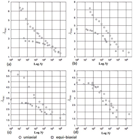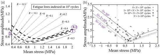 For rubber materials, each principal strain corresponds to a principal stress. As for stress-based damage parameters, the maximum principal Cauchy stress, which is the maximum eigenvalue of the Cauchy stress tensor, usually indicated by , is commonly utilized in rubber fatigue literature. André et al. [51] established a fundamental relationship between crack propagation orientation and stress distribution patterns, demonstrating that crack planes consistently are perpendicular to the maximum principal Cauchy stress direction under simple torsion. Their findings indicated that this stress-based parameter could serve as an effective local descriptor for quantifying multiaxial fatigue damage mechanisms in NR materials. Saintier et al. [53] identified maximum first principal Cauchy stress as a superior damage quantification parameter, demonstrating its capability to precisely predict crack orientation across the diverse fatigue loading scenarios studied. Furthermore, this stress-based approach offers significant advantages over energy- or strain-derived criteria, particularly in its ability to provide realistic fatigue life predictions under hydrostatic stress conditions, thereby eliminating the theoretical limitation of infinite fatigue life predictions associated with alternative methodologies—something that contradicts experimental data. Verron and Andriyana [13] assessed the effectiveness of the maximum principal Cauchy stress using uniaxial and equiaxial experimental data from four different types of rubber materials—filled and unfilled NR compounds, filled and unfilled SBR compounds—provided by Roberts and Benzies [21]. It was found that the maximum principal Cauchy stress gave better overall predictions compared to the maximum stretch ratio and SED, particularly for both filled and unfilled NR. Tao et al. [54] used stress mean and stress amplitude as inputs of various analytical constant life diagram (CLD) models to predict the fatigue life of carbon cord-reinforced hydrogenated nitrile butadiene rubber (HNBR) composites under non-relaxing uniaxial tensional loading conditions. Their comparative analysis revealed that both the enhanced Harris CLD model [55] and piecewise linear CLD [56] demonstrated satisfactory predictive accuracy when validated against experimental fatigue life data.