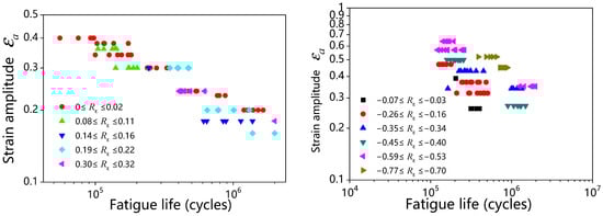 As for the maximum principal strain, five formulations of strain are used as damage parameters considering the nonlinear and finite deformation characteristics of rubber-like materials. The published maximum principal strains [18] consist of the stretch ratio (elongation), engineering strain, Green–Lagrange strain, Almansi–Euler strain, and logarithmic strain (for simplicity, strain limits are confined to amplitudes and maximum values herein and are omitted in the description of damage parameters, unless specified otherwise). Theoretically, all of the strain measures could serve as damage parameters for estimating the fatigue life since they can be converted into each other.