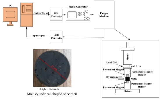 - Yoon, J.-H.; Lee, S.-W.; Bae, S.-H.; Kim, N.-I.; Yun, J.-H.; Jung, J.-H.; Kim, Y.-G. Effect of Cyclic Shear Fatigue under Magnetic Field on Natural Rubber Composite as Anisotropic Magnetorheological Elastomers. Polymers 2022, 14, 1927. [Google Scholar] [CrossRef]