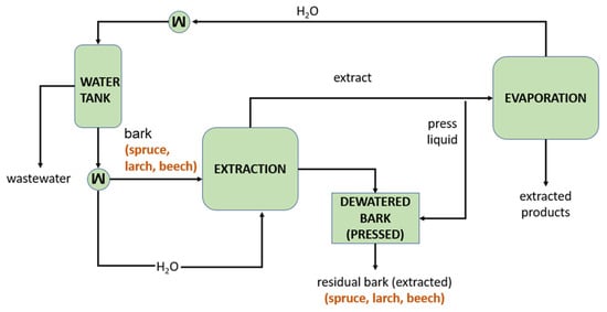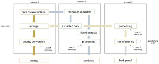 Based on three various scenarios for the bark processing concerning the deliverable products (e.g., energy, by-products (e.g., tannin and bark panels)), the processes (Figure 1) are defined as follows: