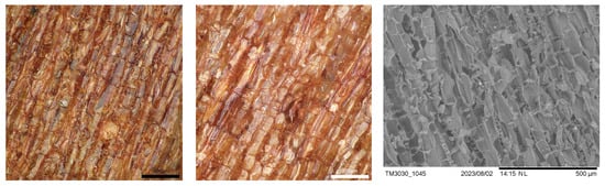 Micrographs of untreated (left) and extracted larch bark (middle). SEM micrograph of extracted larch bark (right).