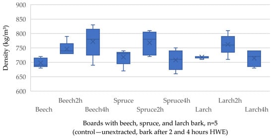 The target density (Figure 4) of all bark-based panels is 750 kg/m3. Due to the manual forming of the press mattress, the measured density ranges between 680 and 830 kg/m3. As results from Table 2, given the p-values of 0.16 and 0.17, which reflect no significant effect of bark species and steam exposure, a trend that reflects differences between the groups (untreated, bark after 2 and 4 h HWE), cannot be drawn.