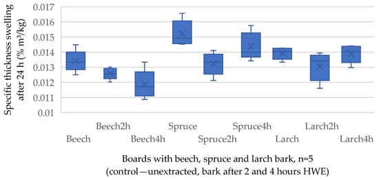 Specific thickness swelling of the bark-based panels produced with unextracted and hot water-extracted raw materials. × marking the average value.