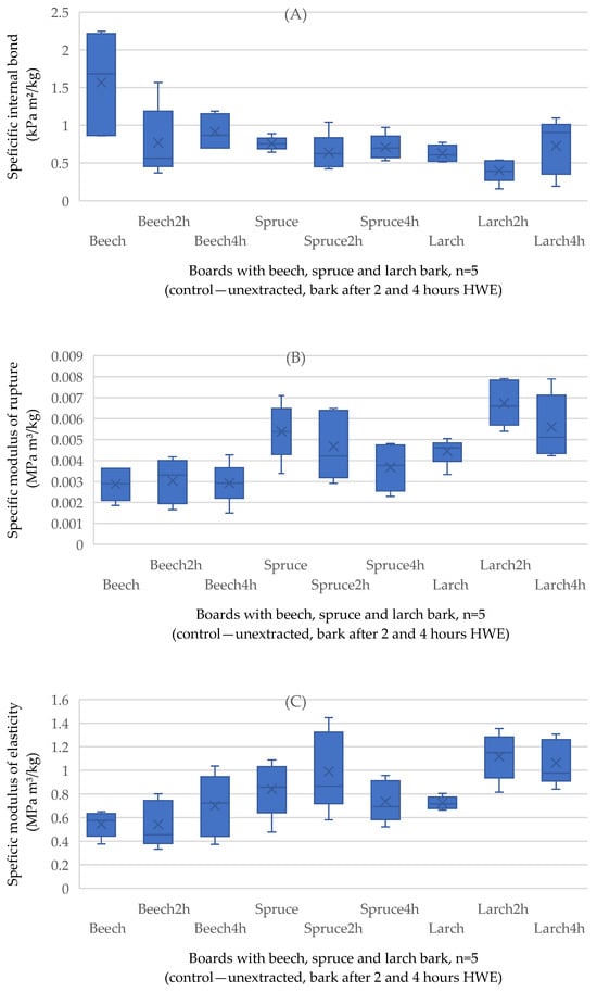 Specific internal bond of the bark-based panels produced with unextracted and hot water-extracted raw materials (A); specific modulus of rupture of the extracted bark-based panels (n = 5) (B) and specific modulus of elasticity of the extracted bark-based panels (n = 5) (C). × marking the average value.
