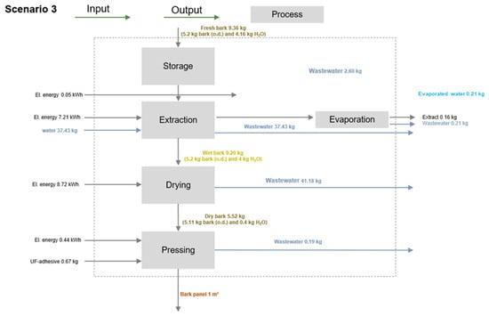 These process diagrams (Figure 8) present three possible scenarios regarding further processing of bark. In Scenario 1, the bark is stored outdoors up to a material moisture content of 20% and then fed into the combustion process. In Scenario 2, another process step is added, namely the hot water extraction. Scenario 3 is the most complex one, because the bark (untreated, extracted after 2 h, and extracted after 4 h) is the raw material for manufacturing bark-based particleboards. In the process diagrams (Figure 8), the electrical energy for the pressing process was calculated for the heating-up of the bark material from 20 to 180 °C according to [42].