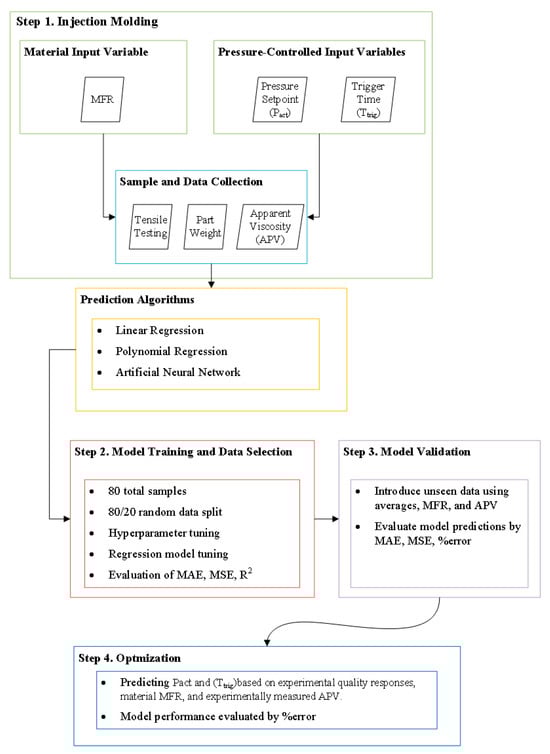The trained machine learning models were then validated (Step 3, Figure 1) by evaluating their effectiveness at predicting part quality parameters (yield stress, modulus, ultimate elongation, and part weight) using hold-out data (material MFR, apparent viscosities, trigger times, and pressures) from a pressure-controlled injection molding process, as seen in step three of the flow chart. This step was crucial to determining the best material viscosity parameter (i.e., MFR or APV). When using MFR, the model did not consider the shot-to-shot variation. In contrast, when using the APV, the model measures the material flow for each cycle. The accuracy of the predicted quality response determined the model’s effectiveness compared to the actual experimental value during the validation step and the minimization of the MAE and MSE values.