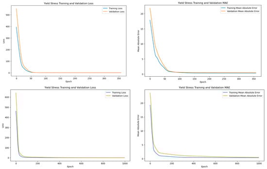 A neural network model was created for each of the quality response variables; however, for simplicity, only plots for the yield stress response will be shown. Figure 2 show the training and validation loss and the training and validation mean absolute error for the yield stress response variable for the Trig2 runs using MFR (Figure 2 top row) and APV (Figure 2 bottom row). These plots highlight the importance of hyperparameter tuning and data splitting as a model that is over- or under-fit. Ideally, as the model continues to learn, the loss and the mean absolute error (MAE) decrease as the number of epochs increases while maintaining a minimum difference between the training and validation errors. A large gap between the training and validation curves could potentially signify poor model performance in the form of over- or underfitting. Additionally, as seen in the figure, both the MFR and APV models show no signs of overfitting thanks to the early stopping implemented (MFR stopped at 376 epochs, while APV stopped at 998 epochs). The significant difference in epochs reflects the complexity of the datasets, the APV model required more training cycles to capture the greater variability in viscosity-related parameters, whereas the MFR model, with more consistent data, converged more quickly. This extended training allowed the APV model to better generalize to the increased shot-to-shot variation present in the dataset. The difference in epochs means that the model with the APV underwent the training process 622 more times than the model run with the MFR data. The additional epochs allow the model to learn from the data more extensively and give the model a chance for better convergence and, thus, a better understanding of the data’s patterns. These additional epochs could have been necessary for the model to better understand the data due to the APV creating that additional variation within the dataset.