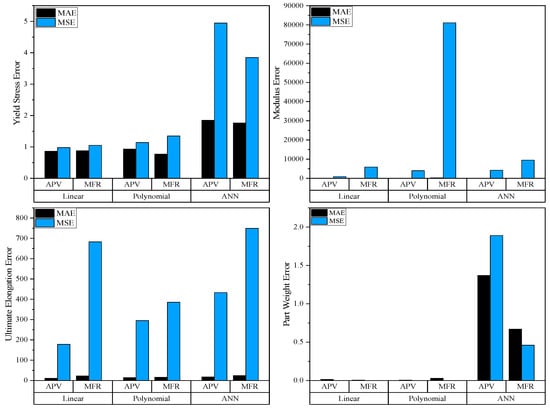 The comparison between the regression models and the ANN can be seen in Figure 3, which compares the MAE and MSE between the three models and the different datasets. As seen in the figure, the MSE is significantly larger for the yield stress, modulus, and ultimate elongation, which signifies that the predictions are distributed relatively evenly amongst the true values. For the weight, however, it can be seen that the MAE is larger than the MSE for all but the ANN using MFR data. This signifies that there were a few outliers in the data that heavily influenced the model. Additionally, it can be seen that the ANN performed worse for all responses except for Modulus (Polynomial with MFR data was the worst performer). Comparing these results to the literature, it can be seen that similar results on the performance between ANN and polynomial regression were found, and the authors concluded that there was no best model for each case [22]. Additionally, they determined that hyperparameter tuning and the data selected for the training of the models were key to preventing overfitting and the best prediction behaviors. However, other authors have compared ANNs to regression analysis and their results show a clear advantage to using an ANN for predicting relationships between inputs and outputs using similar size datasets [35]. The main difference is the amount of variation within the dataset as the authors only used a single virgin polypropylene, and their response variable was dimension stability. It is hypothesized that the complex relationships between the quality responses and the processing inputs were not adequately captured, and additional data would be required to fully grasp the relationship and make more accurate predictions. However, except for part weight, the ANN performed quite similarly to the regression models, with errors below 6% for the Trig2 runs.