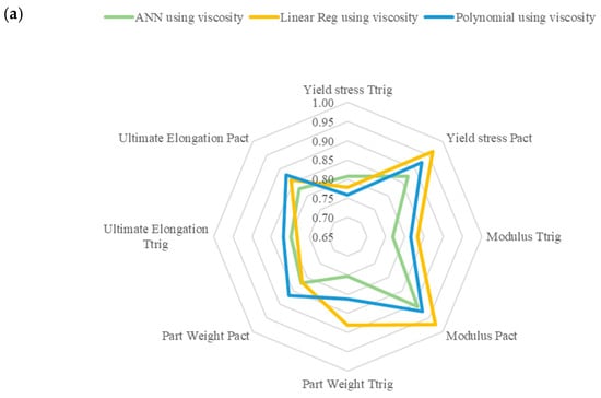 After evaluating the models and their coefficients, the hold-out data used for the ANN were introduced similarly for each regression model. The % error for each of the predicted quality responses and the experimental values for each regression model can be seen in Table 9. From the table, the APV model performs significantly better for the yield stress, modulus, and ultimate elongation response. A best-performing model could not be identified for the part weight response. Comparing the regression models, the linear model performs equally or better than the polynomial model. Whereas, the MFR model outperformed the linear model for the yield stress and ultimate elongation. The polynomial model notably performs very poorly at predicting the modulus when using the MFR data with errors greater than 30%. The error decreased to under 9% when using the APV data. The reason for this is that the polynomial models are known for performing quite well at predicting data that is close to the training data; however, the models tend to collapse when using data outside of the training set. When using MFR, the training data becomes limited, and therefore there are fewer unique training combinations, thus limiting the model. When using the APV, the number of unique training combinations increases, thus allowing the model to be better prepared for more variable validation data.