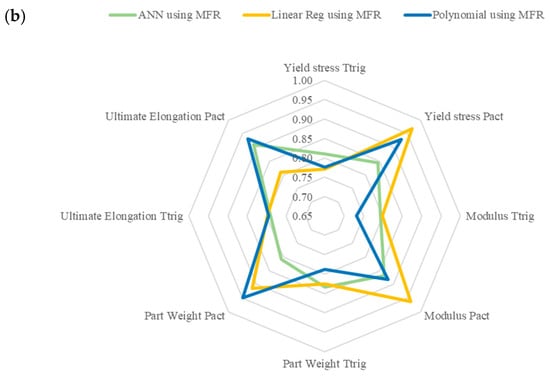 Additionally, the dataset used had no real impact on the optimization problem, as both datasets appear to perform similarly for all models. This could also signify the need for feature reassessment as the difference between the two datasets was evident during the model training and validation. Figure 4a shows a radar chart highlighting the combination of inputs that give the best performance for the APV dataset and Figure 4b for the MFR dataset. The closer to the outside of the radar, the more accurate that specific model is at predicting the response since the data plotted is one error from Table 12. As seen in the figures, the model using MFR data can more accurately predict the Pact value; however, in doing so, it is unable to predict the . The model using the APV data is more accurately able to predict the value; however, in doing so, it sacrifices accuracy in .