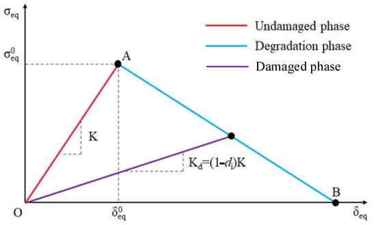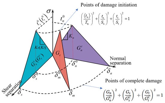 The damage evolution of cohesive elements follows an energy-based mixed-mode power law, as shown in Equation (17). This is illustrated schematically in Figure 2. The two vertical coordinate planes represent the response of cohesive elements under pure normal stress and pure shear stress states. , and represent the fracture toughnesses for the three pure damage modes I, II, and III, respectively.