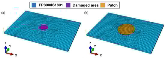 In this study, the patch radius is set as R = 20 mm, and the adhesive layer thickness is defined as ta = 0.4 mm in the finite element model. The schematic illustration of the repaired laminates with the patch is shown in Figure 3b. The mechanical properties of the composite laminates and adhesives were supplied by Weihai Expand Fiber Co., Ltd. (Weihai, China) and are presented in detail in Table 1.