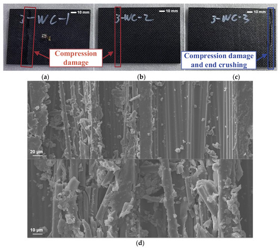 Pristine composite laminates after compression test ((a–c) correspond to specimens 1, 2, and 3, respectively, (d) is the SEM result).