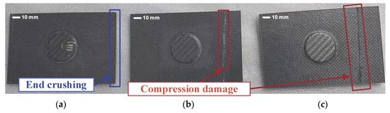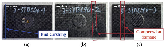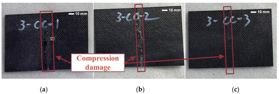 Damaged composite laminates after compression test ((a–c) correspond to specimens 1, 2, and 3, respectively).