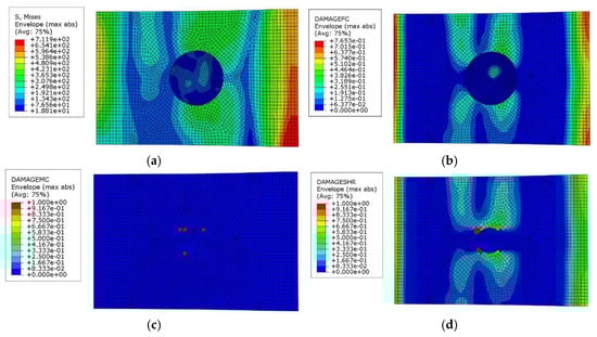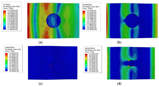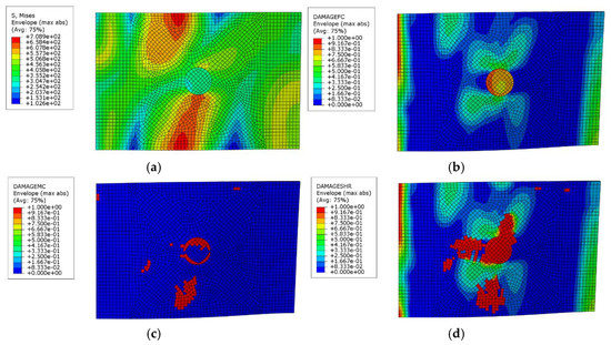 Simulation results for damaged composite laminates after compression test ((a) Stress distribution map, (b) Fiber damage distribution map, (c) Matrix damage distribution map, and (d) Shear damage distribution map).