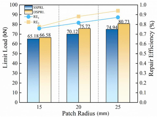 The experimental results are shown in Figure 17. For a patch radius of R = 15 mm, the ultimate strength of SSPRL is 65.15 kN, with a repair efficiency of 75.86%. The ultimate strength of DSPRL is 66.58 kN, with a repair efficiency of 77.49%. For a patch radius of R = 20 mm, the ultimate strength of SSPRL is 70.12 kN, with a repair efficiency of 81.61%. The ultimate strength of DSPRL is 75.72 kN, with a repair efficiency of 88.13%. For a patch radius of r = 25 mm, the ultimate strength of SSPRL is 74.94 kN, with a repair efficiency of 87.22%. The ultimate strength of DSPRL is 80.73 kN, with a repair efficiency of 93.96%. Results indicate that, regardless of whether the repair is single-sided or double-sided, the repair efficiency increases with the patch radius.