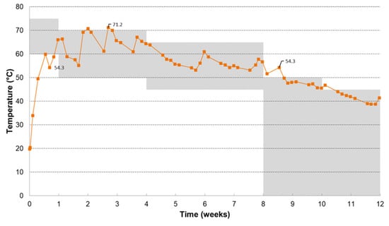 Figure 1 shows the temperature evolution during the composting process and the prescribed temperature conditions. Each time the temperature criteria were not fulfilled, action was taken to maintain optimal temperature conditions. Also, during the composting process, the bin was placed in different incubation rooms (at ambient temperature, at 40 °C, and at 45 °C) to maintain optimal temperature conditions during the different time periods.