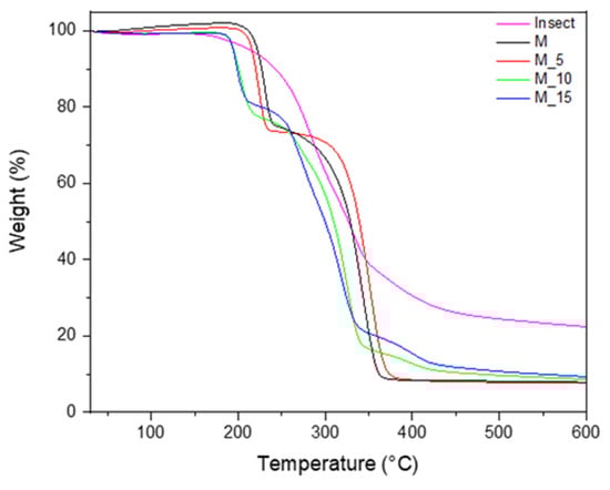 The PBSA/PHBV blend and the biocomposites that contained insect exoskeleton fillers at concentrations of 5%, 10%, and 15% by weight exhibited a distinctive two-stage degradation pattern. In this thermal process, the initial peak degradation temperature could be attributed to the PHBV, while the subsequent peak degradation temperature corresponded to the PBSA. These findings are in line with what was observed in previous research [36,37]. Notably, the thermal decomposition of the filler, which in this case consisted of insect exoskeletons, exhibited a distinctive one-step degradation process at about 200 °C.