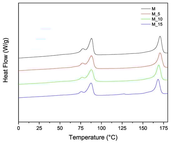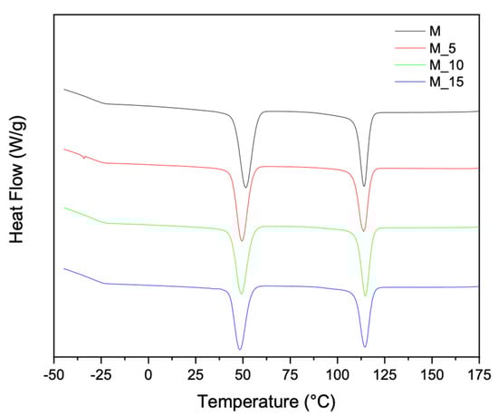 DSC thermograms of polymeric Matrix (M) and composites (M5, M10, M15) (heating run).
