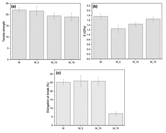 The results of the tensile tests, shown in Figure 5, reveal that as the filler content within the matrix increased, the mechanical properties remain relatively consistent. The tensile strength (Figure 5a) remained relatively unchanged as the filler load increased within the matrix. For the Young’s modulus (Figure 5b), a slight increase was observed when the fibre load was increased from 5% to 15%; however, this increase did not significantly impact the mechanical properties. The elongation at break (Figure 5c) showed a notable decrease from 5% to 10% of the filler load, with a more drastic reduction occurring at 15%. This suggests that in this scenario, the primary role of the filler was to act as a filler rather than reinforcing the composite, which emphasises the importance of considering filler content when tailoring material properties. The mechanical properties presented by the biocomposites are in line with those presented from previous biocomposites based on a biopolyester matrix with natural fillers, such as bran, which were found to be valuable for pot production and use [39,40,41].