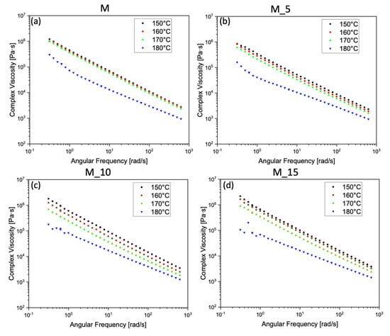 Complex viscosity versus angular frequency in a range of temperatures from 150 °C to 180 °C of: (a) the matrix (M), the composites (b) M_5, (c) M_10, (d) M_15.
