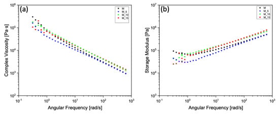 Figure 7 shows the values for composites M_10 and M_15, which were similar, especially in the higher angular frequency range. The pure matrix exhibited a more pronounced shear-thinning behaviour compared with the others, while the M_5 composite showed a lower viscosity value than the other composites up to a range of average angular frequencies, then aligned with the matrix values at high angular frequencies.