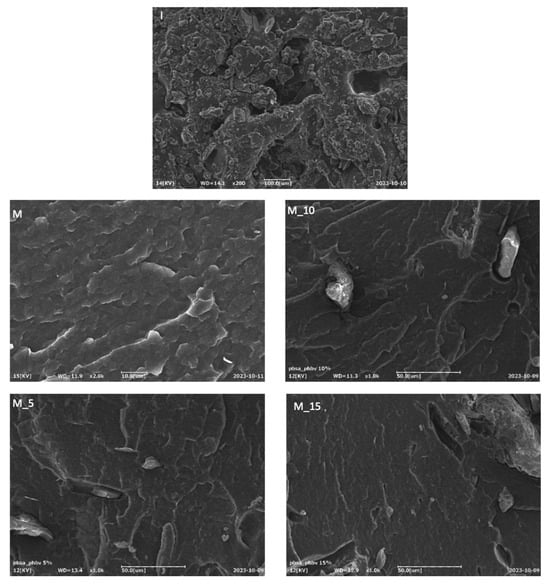 Conducting a morphological analysis is a pivotal step in assessing the efficacy of the insect exoskeleton filler’s dispersion within the polymeric matrix and comprehending the interactions between the matrix and fillers. This analysis involved a detailed examination of the fractured surfaces of the specimens, which provided critical insights into the structure and composition of these composites. The Scanning Electron Microscopy (SEM) images, presented in Figure 8, highlight significant findings that reveal that the analysis of the filler incorporated into the matrix exhibited an uneven morphology. Specifically, it appeared in the form of flakes and short fibres, which suggests a lack of uniformity in its structure. This detailed examination provides valuable insights into the filler’s characteristics within the composite. The surface morphology of the pure matrix (M) appeared exceptionally smooth. This observation held across all the SEM images, irrespective of the filler loading, signifying a consistent and uniform distribution of (I) fillers throughout the thermoplastic matrix. Notably, the biocomposite that contained 15% by weight of filler stood out due to its remarkable dispersion within the matrix by showcasing an exceptionally even distribution.