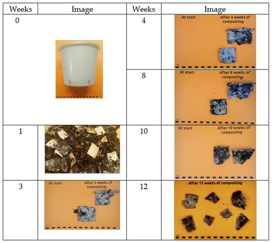 The developed biocomposite pots based on PBSA/PHBV and PBSA/PHBV/15% insect exoskeleton powder were produced from polymers that were already certified according to EN 13432 [16], with the optional addition of insect exoskeleton material. The insect exoskeleton filler was not chemically modified and did not contain any additional organic additive in a concentration above 1% (dry weight), and the total sum of these organic constituents without a determined biodegradability did not exceed 5%. In this case, disintegration was studiedto attest to the compostability according to EN13432 [16]. The disintegration of the demonstration PBSA/PHBV pot (1.55 mm bottom, 1.56 mm sidewall) and PBSA/PHBV/15% insect exoskeleton powder pot (1.52 mm bottom, 1.60 mm sidewall) was qualitatively tested according to ISO 16929 [35]. The thickness is an important characteristic, as a high thickness will impact the disintegration rate negatively. The pilot-scale aerobic composting test simulated as closely as possible a real and complete composting process in composting bins of 200 L. The pots both had a height of 15 cm and bottom diameter of 14 cm and were cut into pieces of 5 cm × 5 cm. They were added to a mixture of fresh Vegetable, Garden, and Fruit waste (VGF) and structural material and introduced in an insulated composting bin, after which composting spontaneously started. Like in full-scale composting, inoculation and temperature increases happen spontaneously. During the composting, the contents of the vessels were turned manually, at which time the test item was retrieved and visually evaluated. The fresh biowaste was derived from a separately collected organic fraction of municipal solid waste, which was obtained from the waste treatment plant of Erembodegem, Belgium. The biowaste at the start should have a moisture content and a volatile solids content of the total solids (TSs) of more than 50% and a pH above 5. From Table 2, it can be observed that these requirements were fulfilled. The biowaste contained a moisture content of 73.1% and a volatile solids content of 85.3% of the TSs. At the start, a pH of 5.6 was measured, and after 1.7 weeks of composting, the pH had increased to above 8.5. Furthermore, the C/N ratio of the biowaste at the start should preferably be between 20 and 30. An optimal C/N ratio of 28 was found for the biowaste.
