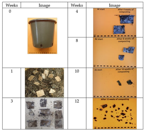 The disintegration of the PBSA/PHBV pot (thickness: ±1.55 mm (bottom), ±1.56 mm (sidewall)), cut into 5 cm × 5 cm pieces, is reported in Figure 9.