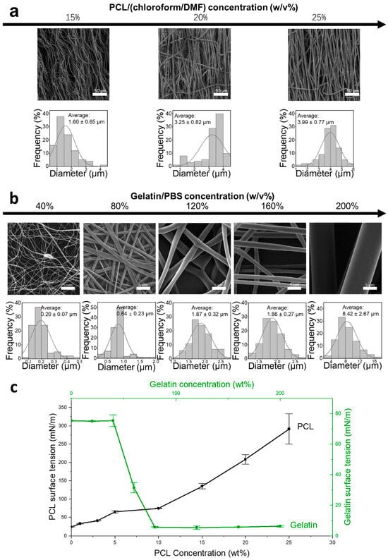 Exploration of the aqueous gelatin core-based coaxial electrospinning formula. Variation in spinnability of (a) PCL/chloroform/DMF with concentrations ranging from 15 to 25 w/v%, and (b) gelatin/PBS, with concentrations from 40 to 200 w/v% analyzed through SEM images to determine the corresponding fiber diameters (n = 100). (c) A dual-axis line graph illustrating the relationship between surface tension and concentration for both PCL and Gelatin solutions. The left Y-axis and bottom X-axis detail the surface tension of PCL, starting from 0 w/v% (pure chloroform/DMF mixture), while the right Y-axis and top X-axis display the gelatin solution’s surface tension starting from 0 w/v% (pure PBS solution). Each configuration was tested thrice (n = 3).