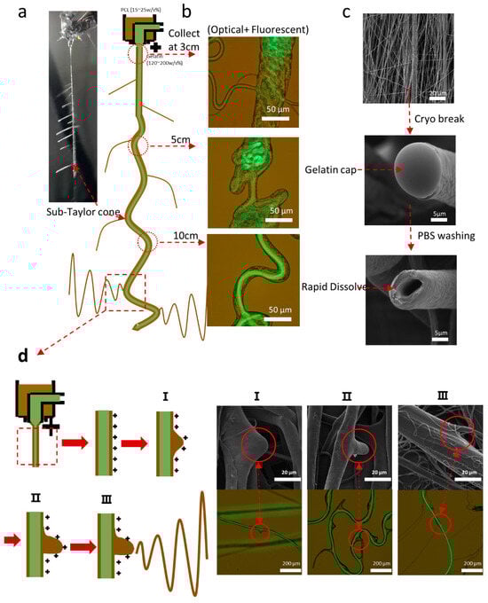 Recapitulation of characteristics in the coaxial electrospinning process and fiber formation. (a) A real-time photograph alongside an illustrative sketch of the fiber formation in electrospinning. (b) Merged fluorescent microscopy images of fibers collected at distances of 3 cm, 5 cm, and 10 cm, illustrating core-driven fiber formation. (c) SEM images depicting the typical features of coaxial fibers. (d) A compilation of sketches, fluorescent merged with optical images, and SEM images to detail the process of sub-Taylor cone formation.