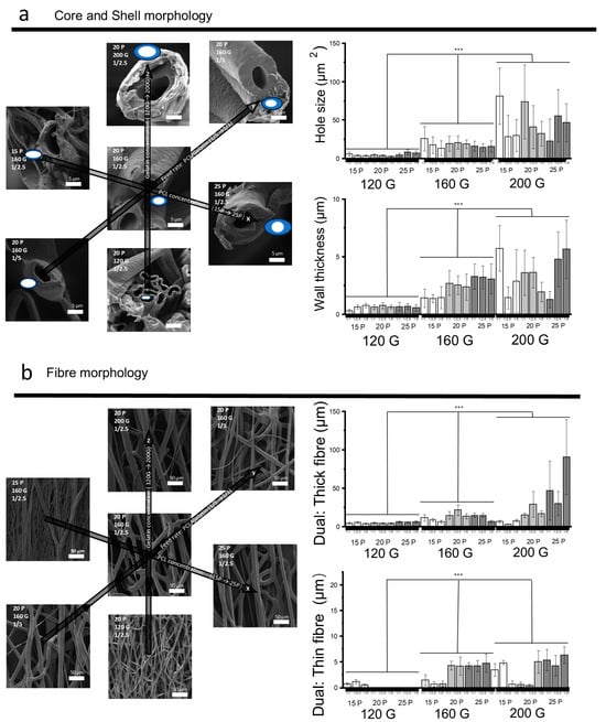 The effects of PCL concentration, gelatin concentration, and the feed ratio on (a) fiber pore structure and (b) fiber morphology. This figure shows the influence of three parameters, each tested at three different levels, on the hollow structure and fiber morphology. The experimental conditions and outcomes are organized along three axes for clarity. For (a) The X-axis represents PCL concentration, incrementally increasing from 15 w/v% (15P) to 25 w/v% (25P). The Y-axis details the feed rate ratio of PCL to gelatin, with variations set at 1/5, 1/2.5, and 1/1. The Z-axis tracks gelatin concentration, 120 w/v% (120G), 160 w/v% (160G), and 200 w/v% (200G). For (b) the The X-axis represents the group combinations. Statistical significance is denoted by ‘***’, indicating a p-value of less than 0.001.