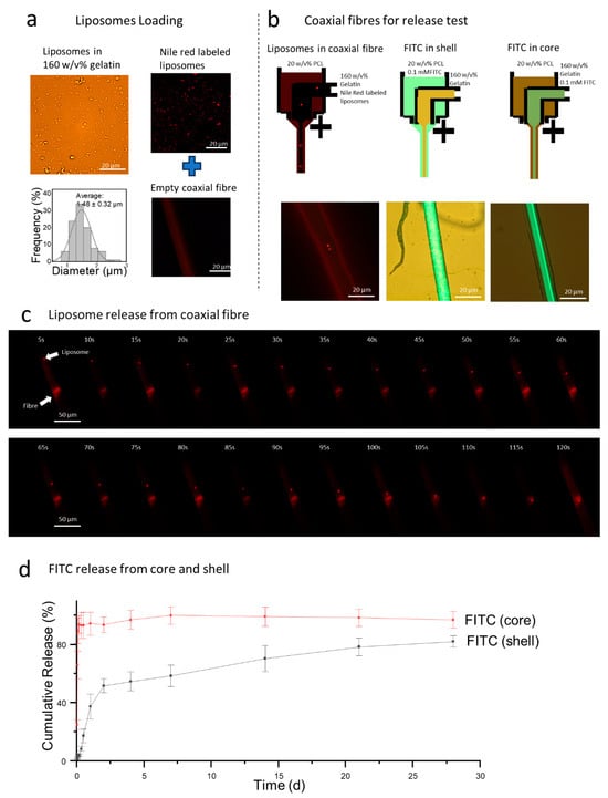 The release profiles of liposomes and FITC from electrospun PCL shell/gelatin core coaxial fibers, prepared with 160 w/v% gelatin, 20 w/v% PCL, and a 1/2.5 feed ratio. (a) Nile Red-labeled liposome images captured via fluorescent microscope in optical and TRITC modes. (b) Sketches and microscope images of the coaxial fiber for release test for liposomes encapsulated in the coaxial fiber, FITC embedded in gelatin core, and PCL shell. (c) Time-lapse images illustrating the rapid evacuation of liposomes from the scaffold. (d) The FITC release profiles from the core and shell.
