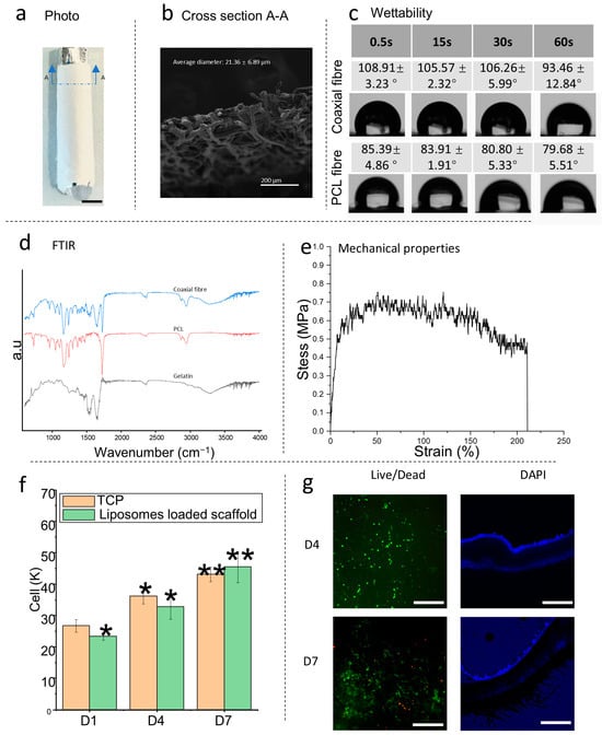 Characterization of the liposome-loaded fibers, showcasing (a) a photograph, (b) the cross-sectional details (marked as a blue line in (a)) via SEM images. (c) The wettability of the coaxial fiber and the net PCL fiber, with typical images captured at time points of 0.5, 15, 30, and 60 s. (d) FTIR spectra, and (e) the typical stress–strain. (f) Cell proliferation measured over 7 days, assessed via the PrestoBlue assay. (g) Live/dead (left, live green, dead red) and DAPI (right, cell nuclei blue) staining results on days 1, 3, and 7. Statistical annotations are as follows: ‘*, **’ indicates p < 0.05 and 0.01 < p < 0.05. The scale bar for the fluorescent images represents 200 μm.