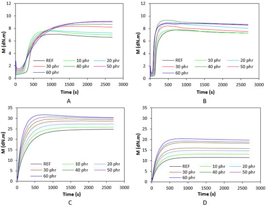 Curing isotherms of SBR-based composites cured with sulfur system (A). NBR-based composites cured with sulfur system (B). SBR-based composites cured with peroxide system (C). NBR-based composites cured with peroxide system (D).
