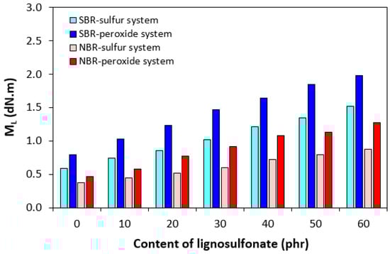 Influence of lignosulfonate content and curing system composition on minimum torque ML of composites.