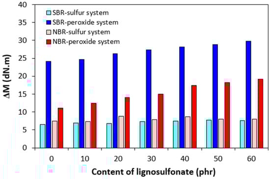 Influence of lignosulfonate content and curing system composition on torque difference ΔM of composites.