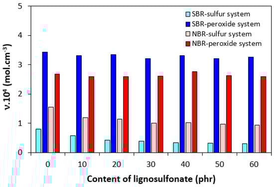 Calcium lignosulfonate was incorporated into rubber compounds based on styrene–butadiene rubber (SBR) and acrylonitrile–butadiene rubber (NBR) in amounts ranging from 10 to 60 phr. A sulfur-based curing system and a peroxide curing system consisting of dicumyl peroxide in combination with methacrylic acid zinc salt were used for cross-linking of the compounds. The aim of the work was to investigate the influence of lignosulfonate and curing system composition of the cross-linking process, morphology, physical–mechanical and dynamic–mechanical characteristics of the composites. The achieved results showed that peroxide cured composites demonstrated higher cross-link density, which was found not to be influenced by the content of lignosulfonate. The cross-link density of sulfur-cured composites was lower and showed a decreasing tendency with increasing amounts of the biopolymer. A lower cross-linking degree was reflected in a higher elongation at break and higher increase in the elongation at break of the corresponding composites. On the other hand, peroxide-cured composites exhibited a higher modulus M100 and higher hardness. The microscopic analysis revealed that co-agent in peroxide vulcanization contributed to the improvement of adhesion between the biopolymer and the rubber resulting in higher tensile strength of the equivalent composites. The higher cross-link density of peroxide-cured composites caused higher restriction of the chain segments’ mobility, due to which these composites exhibited a higher glass transition temperature.