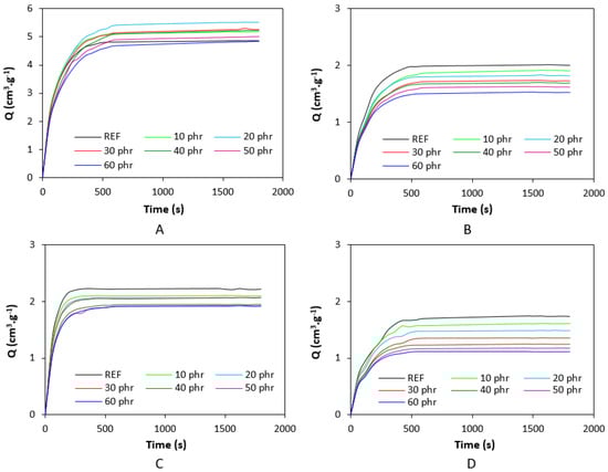 Swelling indexes of SBR-based composites cured with sulfur system (A). NBR-based composites cured with sulfur system (B). SBR-based composites cured with peroxide system (C). NBR-based composites cured with peroxide system (D).