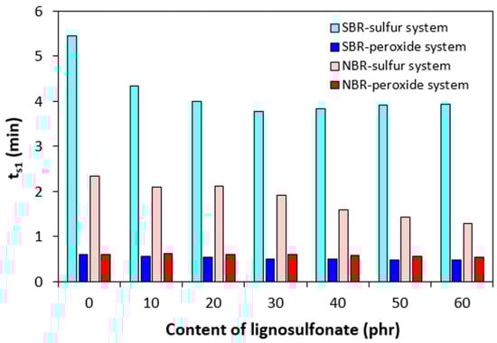 Influence of lignosulfonate content and curing system composition on scorch time ts1 of composites.