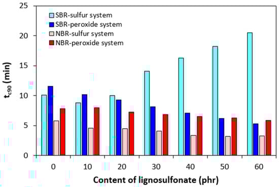 The experimental results showed that sulfur-cured rubber compounds based on NBR demonstrated a lower scorch time and lower optimum cure time when compared to corresponding compounds based on SBR. Simultaneously, both characteristics showed a decreasing trend with increasing content of the biopolymer, demonstrating its accelerating effect on the sulfur vulcanization of NBR-based formulations. However, the prolongation of the optimum cure time of SBR-based formulations with increasing content of lignosulfonate suggests that it has a retarding effect in the sulfur vulcanization of SBR.