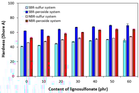 The incorporation of lignosulfonate resulted in an increase of the composites’ hardness, suggesting that the hardness of the biopolymer was higher than that of the rubbers (Figure 8). The dependence of hardness on the type of rubber matrix and curing system composition was directly proportional to cross-link density (Figure 4). The highest cross-link density of composites based on SBR cured with the peroxide system was responsible for the highest hardness. On the other hand, the equivalent composites cured with the sulfur system with the lowest cross-linking degree exhibited the lowest hardness. The hardness of composites based on NBR ranged between the sulfur- and peroxide-cured composites based on SBR and was higher for peroxide-cured counterparts, again following the trend of cross-link density.