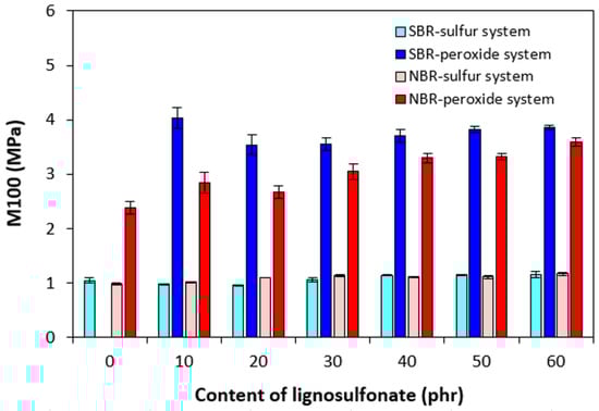 The higher cross-linking degree of both composite types cured with peroxide system was reflected in the higher modulus M100 (Figure 9). The M100 of NBR-based composites cured with the peroxide system was found to increase with increasing content of calcium lignosulfonate. The M100 of the peroxide-cured reference based on SBR was not possible to detect as this sample ruptured before reaching 100% elongation. The composites cured with the sulfur system demonstrated almost the same modulus with no influence on the biopolymer content. As also shown, the M100 of sulfur-cured composites was much lower than that of peroxide-cured equivalents due to their much lower cross-link density.