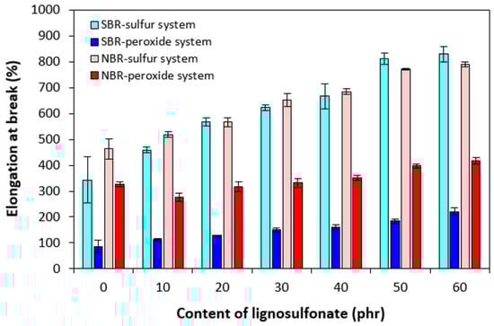 On the other hand, the lower cross-link density of composites cured with the sulfur system resulted in their higher elongation at break (Figure 10). The elongation at break of the sulfur-cured composites based on NBR and SBR was very similar and was significantly dependent on the amount of the biopolymer. At the maximum lignosulfonate content, the elongation at break increased by less than 500% for SBR-based composites (from about 340% for the reference up to 830% for the composite with 60 phr of the biopolymer). In the case of sulfur-cured NBR-based composites, the elongation at break increased from 460% up to 790% by an increase in biopolymer content from 0 up to its maximum content. The higher the cross-link density, the higher the restriction of rubber chain segments’ elasticity and mobility, resulting in a decrease in elongation at break. The lowest elongation at break was exhibited by the SBR-based composites cured with the peroxide system with the highest cross-linking degree. As the cross-link density of peroxide-cured composites almost did not change with the change in lignosulfonate content, the elongation at break of the equivalent composites was much less dependent on lignosulfonate content. When compared to the references, the elongation at break increased by about 90% and 140% for the maximally filled composites based on NBR or SBR, respectively. Another factor contributing to the different elongation at break of sulfur- and peroxide-cured composites is the structure of the formed cross-links. Longer and more flexible sulfidic cross-links facilitate micro-Brownian motion of the chain segments between the cross-links, which results in better elastic properties in the sulfur cured rubber materials. Higher elasticity of the chain segments causes higher redistribution of the deformation strains within the rubber matrix, resulting in higher tensile characteristics, too. On the other hand, shorter and rigid carbon–carbon bonds restrict the orientation and mobility of the chain segments, which results in formation of local stress concentrations. To that correspond the worse dynamic and tensile behavior of peroxide-cured vulcanizates in general [27,29,52].