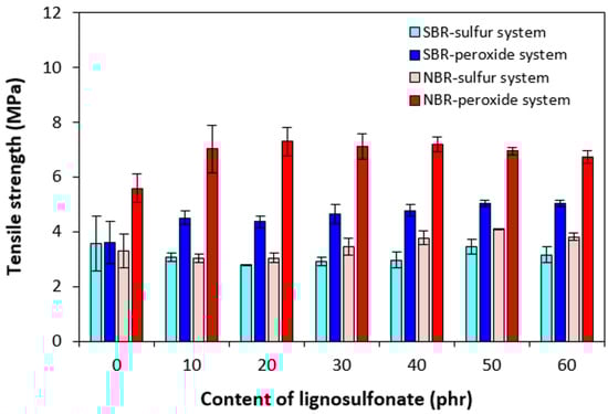 From Figure 11, it becomes apparent that with the exception of the peroxide-cured reference sample based on NBR, the other reference samples exhibited roughly the same tensile strength. The tensile strength of sulfur-cured composites based on SBR was almost not influenced by the amount of the biopolymer, and it fluctuated only in a very low range of experimental values. The influence of lignosulfonate on the tensile strength of sulfur-cured NBR-based composites was also very low, though highly filled NBR-based composites exhibited slightly higher tensile strength when compared to equivalent sulfur-cured composites based on SBR. The application of the peroxide curing system resulted in the enhanced tensile behavior of composites, and the highest tensile strength was manifested by peroxide-cured composites based on NBR. By the incorporation of 10 phr of the biopolymer, an improvement in the tensile strength of both peroxide-cured composites was recorded when compared to the references. Then, no significant influence of lignosulfonate content on tensile strength was observed. The higher tensile characteristics of peroxide-cured vulcanizates can be attributed to the presence of a co-agent in peroxide vulcanization.