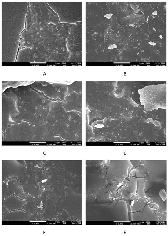 SEM images of sulfur-cured SBR-based composites filled with 10 phr of lignosulfonate (A), 30 phr of lignosulfnate (C), and 60 phr of lignosulfonate (E); sulfur-cured NBR-based composites filled with 10 phr of lignosulfnate (B), 30 phr of lignosulfnate (D), and 60 phr of lignosulfonate (F).