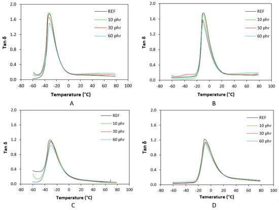 Temperature dependences of loss factor tan δ for SBR-based composites cured with sulfur system (A), NBR-based composites cured with sulfur system (B), SBR-based composites cured with peroxide system (C), and NBR-based composites cured with peroxide system (D).