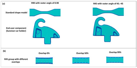 (a) Dogbone and sunvisor holder clip with three different raster angles. (b) R45 with three different overlaps.