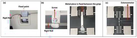(a) The actual mechanism of the sunvisor holder clips. (b) The set up for conducting a tensile test on the sunvisor holder clips using the Instron machine. (c) The tensile test of the dogbone standard specimen using the Instron machine with an extensometer.