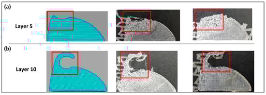 Figure 6 illustrates the impact of printing temperature and speed on the manufacturability of the sunvisor holder clip, particularly at layers 5 and 10, where the curved surface begins to form. The left column shows sliced CAD models of the component, while the middle and right columns display actual printed samples at a speed of 30 mm/s and a temperature of 235 °C, with red boxes highlighting critical defect regions.